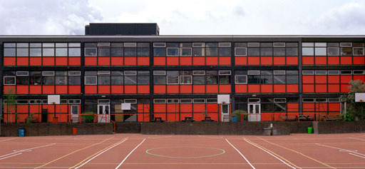 in a local South London school. The portraits,with the pupils wearing their red school uniforms were shown in a row alongside the photograph of the red school building with its grid like architecture